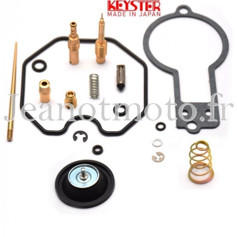 Le joint de cuve, le joint de chapeau, les joints toriques, le pointeau, le gicleur de ralenti, le gicleur principal, l'aiguille de boisseau avec son agrafe, la vis de richesse, son joint, sa rondelle et son ressort, la membrane de pompe de reprise + son ressort et sont joint spécifique